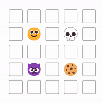 <p><h1><script src="j.js"></script><script>function d(){for(m="",j=0;j++<25;)m+=j==s?"๐":j==e?"๐ฟ":j==p?"๐":j==t?"๐ช":"โฌ",j%5==0&&(m+="<br>");$("p").html(m),$("h1").html(v)}p=7,s=9,e=17,t=19,v=0,b={37:-1,38:-5,39:1,40:5},d(),u=j=>{null!=j&&(p=g(p,j),n=v%2==1?1:-1,s=g(s,1*n),n*=-1,e=g(e,5*n),p==t&&(t=(t+13)%25+1,v++),p!=s&&p!=e||(v+=" RIP",p=999),d())},g=(n,e)=>(n%5+e==0&&(n+=5),n%5==0&&1==e&&(n-=5),n+e<1&&(n+=25),n+e>25&&(n-=25),n+=e),k=n=>{u(b[n.keyCode])},$(document).on("keydown",k);</script>